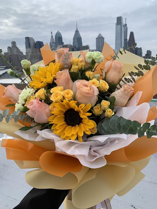 sunflower2, roses6, spray roses4, mini carnation4 and greens