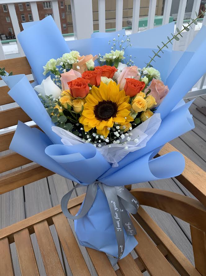 sunflower2, mix roses6, mix spray roses4, mini carnation4 and greens