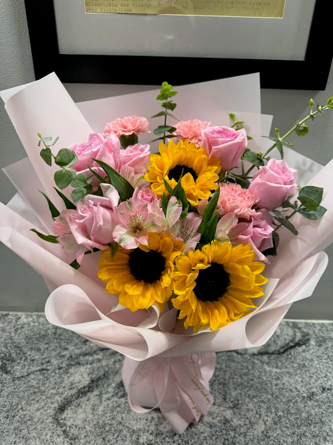 Includes: Two sunflowers, pink-colored bouquets arranged by the designer